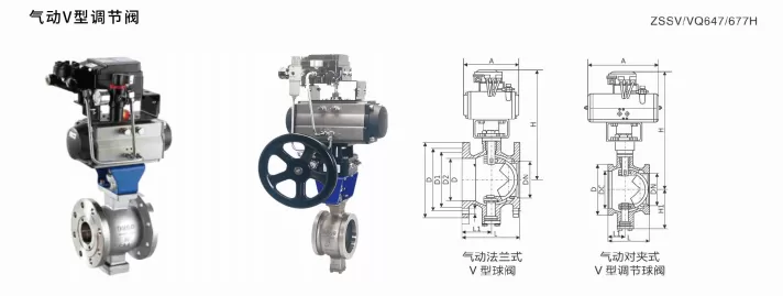 气动对夹式V 型调节球阀主要外形及尺寸(单位:mm)
